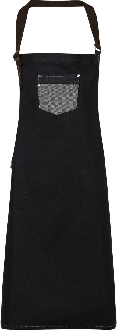 350g/m², 100% denim bavlna s akrylovým potahem předepraný vzhled, materiál odpuzující vodu, 100cm dlouhé popruhy z umělé kůže, nastavitelné šle s přezkami, kontrastní jeans štepování a detaily látky, našitá kapsa a poutko, lze prát na 40°, šířka: 72cm, délka: 86cm