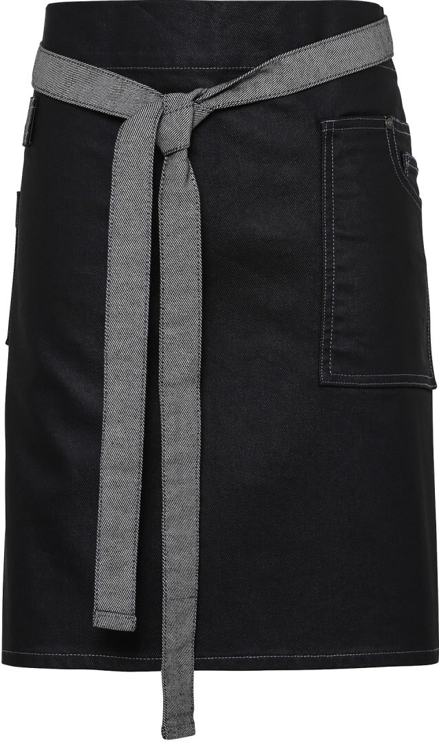 350g/m², 100% denim bavlna s akrylovým potahem předepraný vzhled, materiál odpuzující vodu, 100cm dlouhé popruhy, nastavitelné šle s přezkami, kontrastní jeans štepování a detaily látky, našitá kapsa a poutko, lze prát na 40°, šířka: 50cm, délka: 70cm