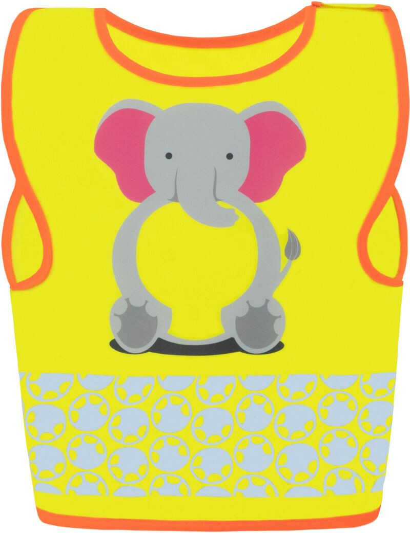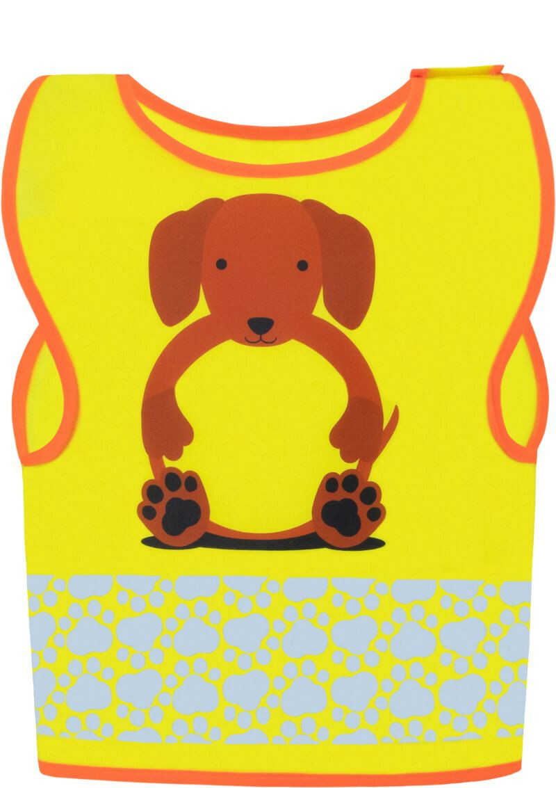 Zvířecí motivy s oblastí pro potisk na břiše, zapínání na suchý zip na boku a rameni, certifikováno podle EN 17353:2020 typ AB3 (viditelnost za denního světla a tmy), CO2 neutrální, reflexní pruh, XXS 3-4 roky, XS 5-7 let.