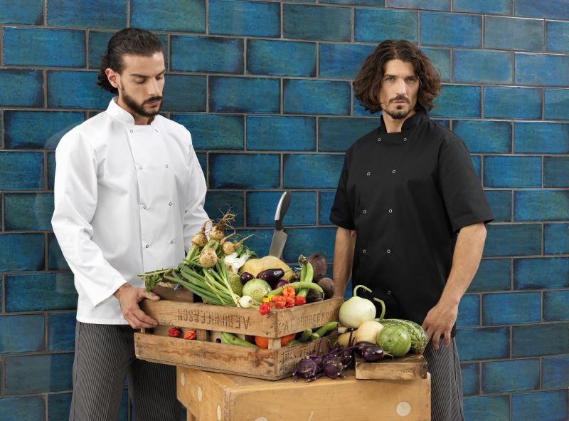 Unisex, mandarín límeček, překrývající se zapínání na 10 patentek, pratelné na 60°, průmyslové praní pratelné na 85°, lze sušit v sušičce při nízké teplotě.