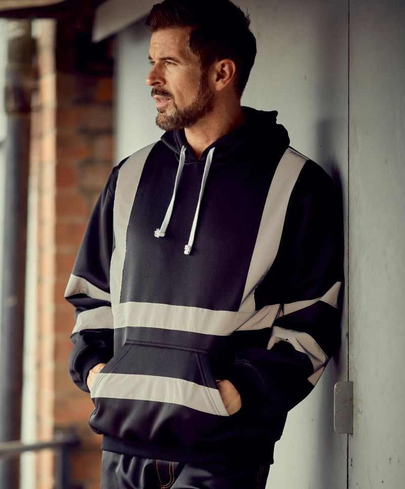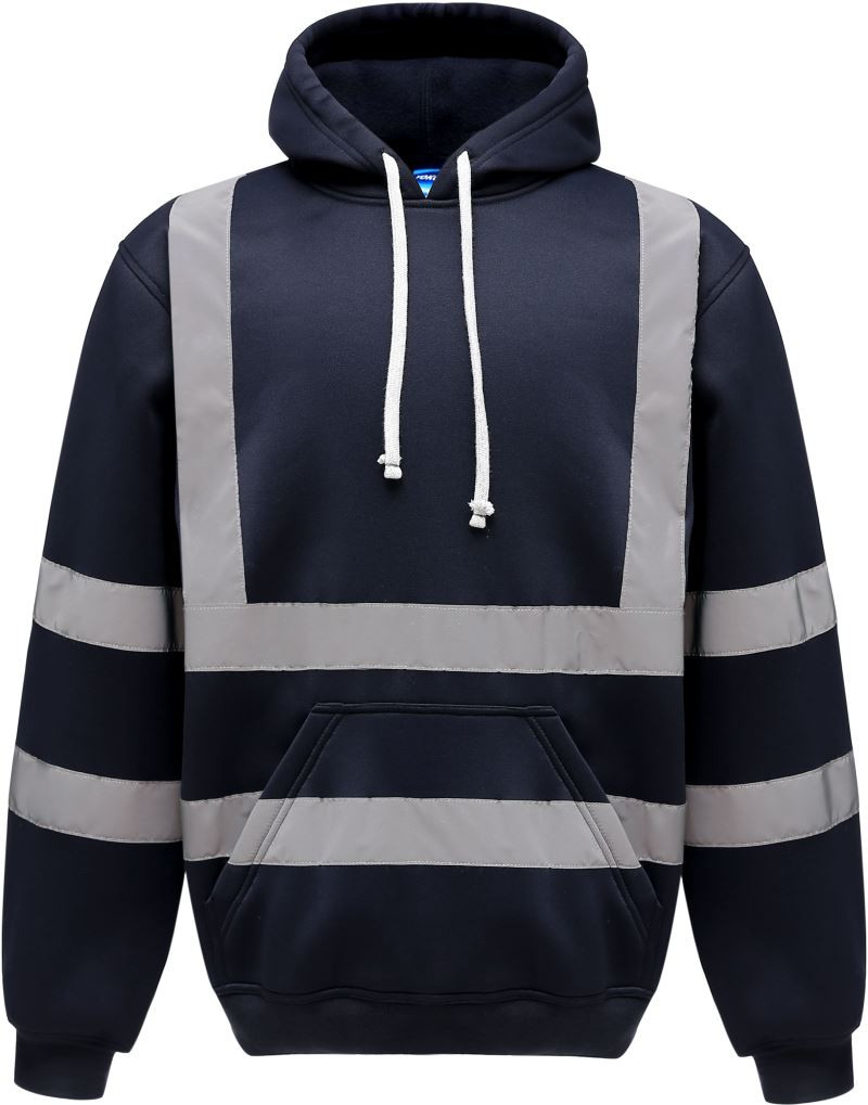 Kapuce se stahovací šňůrkou, krční lemovka, nízko položená ramena, žebrované manžety na rukávech a lemu, klokaní kapsa, dvojité švy, měkká na omak, barvy Hi-Vis certifikované podle normy EN ISO 20471 třídy 3, ostatní barvy umožňují zvýšenou viditelnost, garantované reflexní vlastnosti podle EN – normy pro 25 praní, 2 reflexní pruhy na rukávech, 1 reflexní pruh přes každé rameno, dva reflexní pruhy široké 5 cm kolem těla, pratelné na 40°