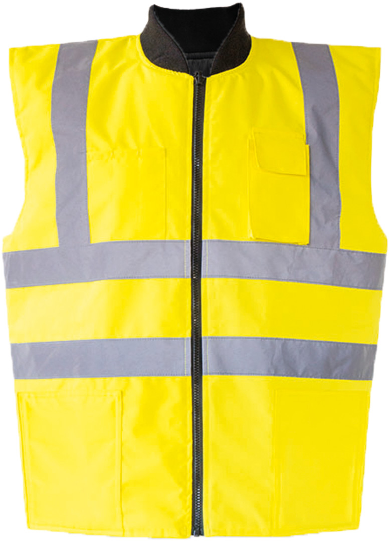 100% polyester, polyesterová podšívka. 2 různé způsoby nošení, varianta A: vesta pro vysokou viditelnost ve fluorescenční žluté nebo oranžové barvě, dvě přední kapsy, kapsa na smartphone, držák na pero, 300D Oxford s vrstvou odpuzující nečistoty, dva 5 cm široké reflexní pruhy, dva pruhy přes rameno, varianta B: černá prošívaná vesta se dvěma předními kapsami, certifikovaná podle EN ISO 20471 třída 2, oranžová také odpovídá GO / RT 3279