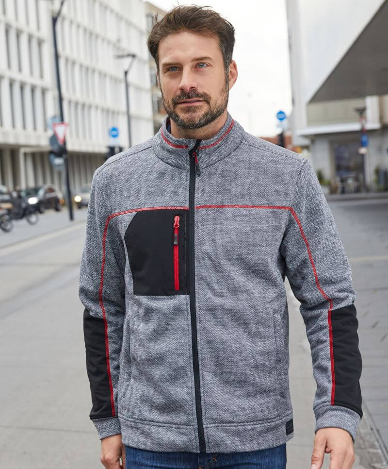 Pánská pletená fleecová bunda se stojatým límcem, skrytý přední zip po celé délce s chráničem brady, zipy YKK, 2 boční kapsy se skrytým zipem, 2 vnitřní kapsy, tkaná náprsní kapsa s kontrastním zipem, kontrastní švy, vzhled melange, zdrsněná uvnitř, doporučené prát na 30 °. Vyrobená z 80% recyklovaného polyesteru a 20% polyesteru.
