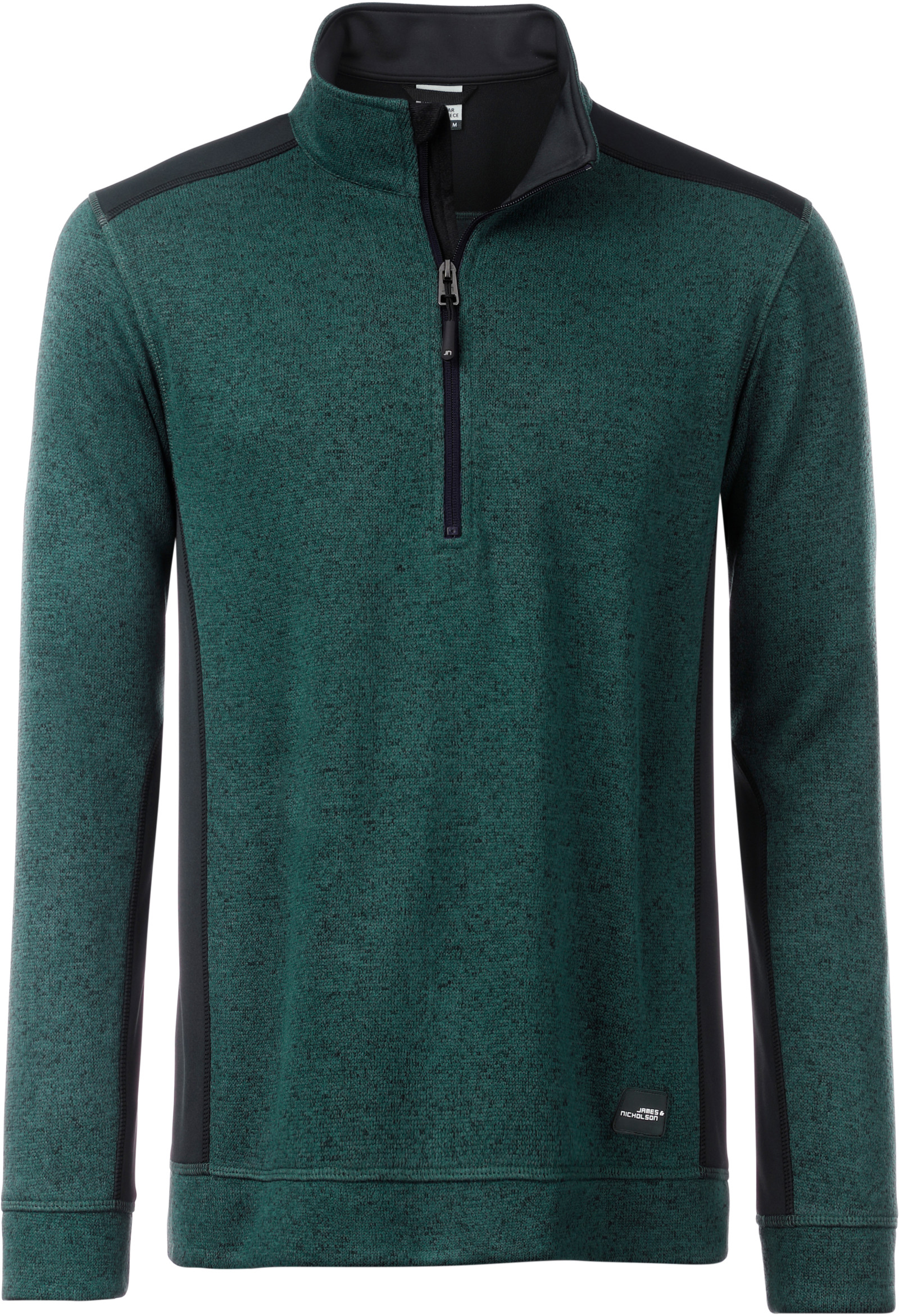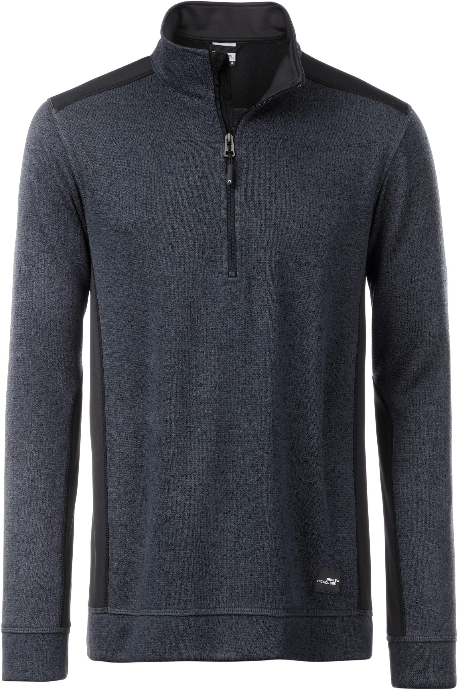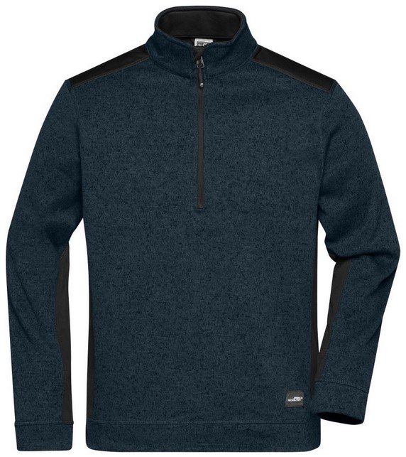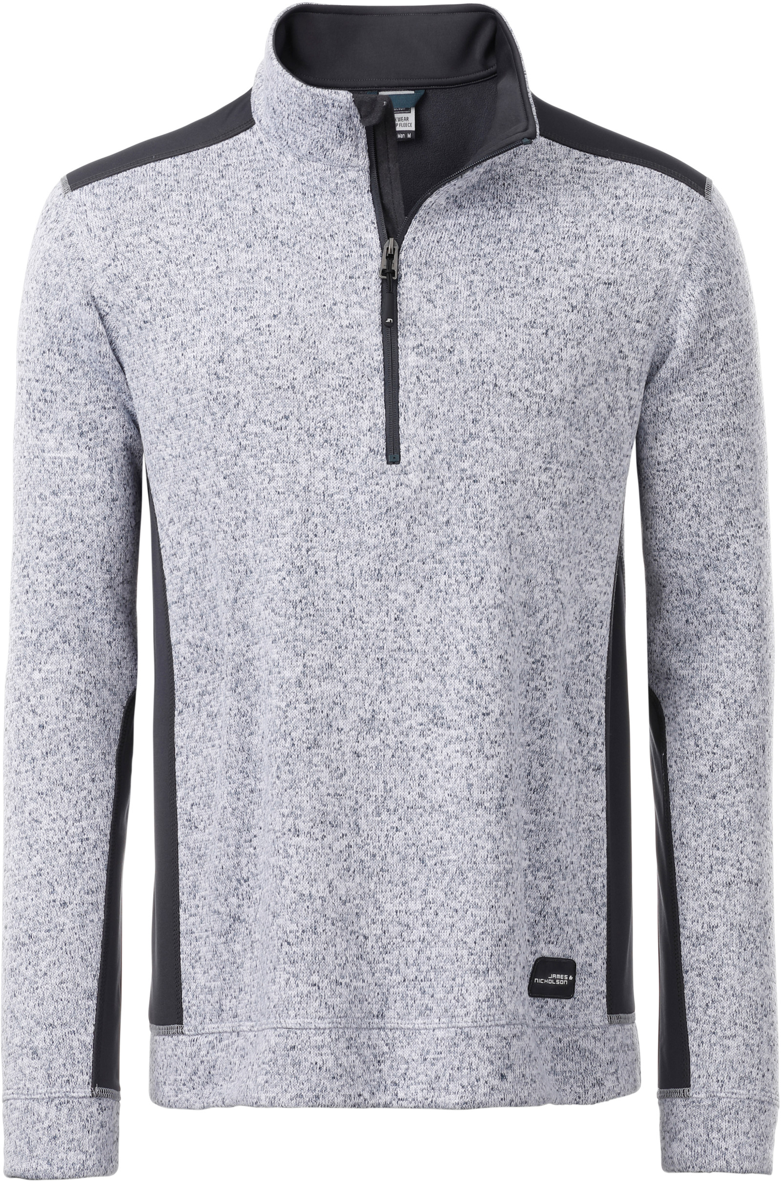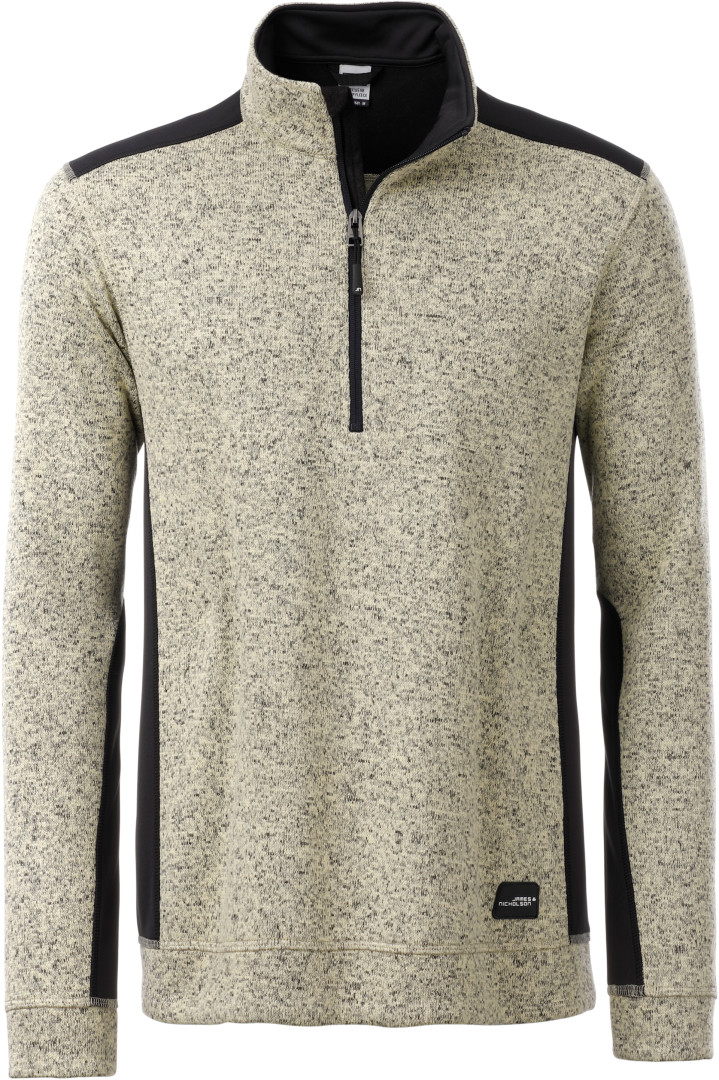 280g/m², 100% polyester, stojáček se skrytým zipem s ochranou brady a klopou proti větru, teplá a měkká tkanina v melírovaném vzhedu, snadná na údržbu, vnější strana v pleteném vzhledu, vnitřní strana načechraná, elastické softshellové vklady na bocích ramenou a rukávech.