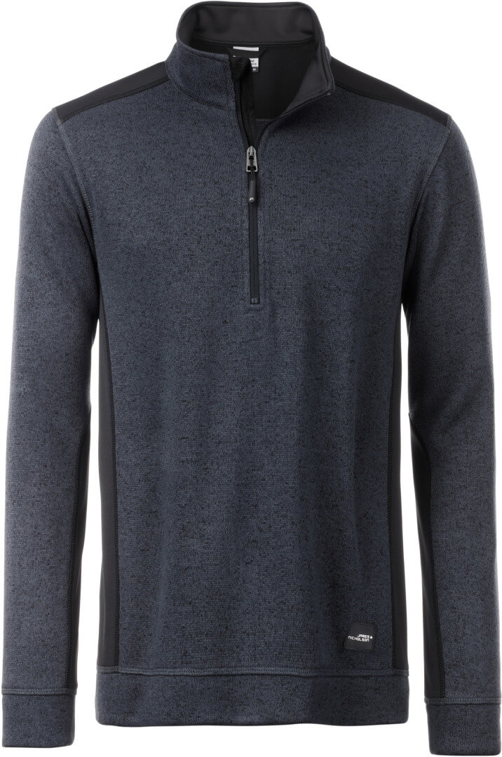 280g/m², 100% polyester, stojáček se skrytým zipem s ochranou brady a klopou proti větru, teplá a měkká tkanina v melírovaném vzhedu, snadná na údržbu, vnější strana v pleteném vzhledu, vnitřní strana načechraná, elastické softshellové vklady na bocích ramenou a rukávech.