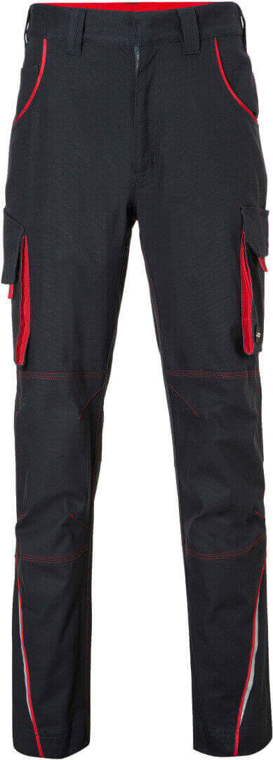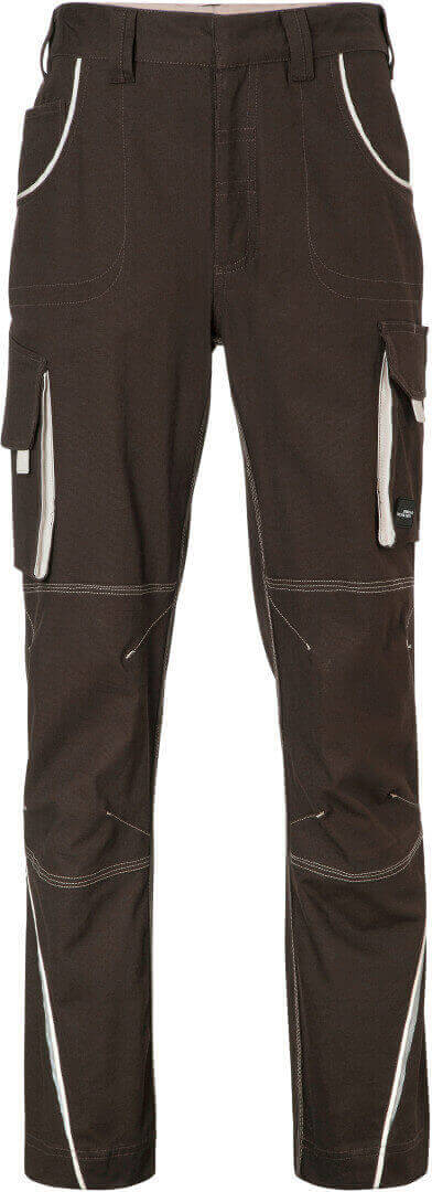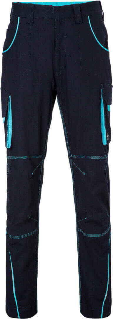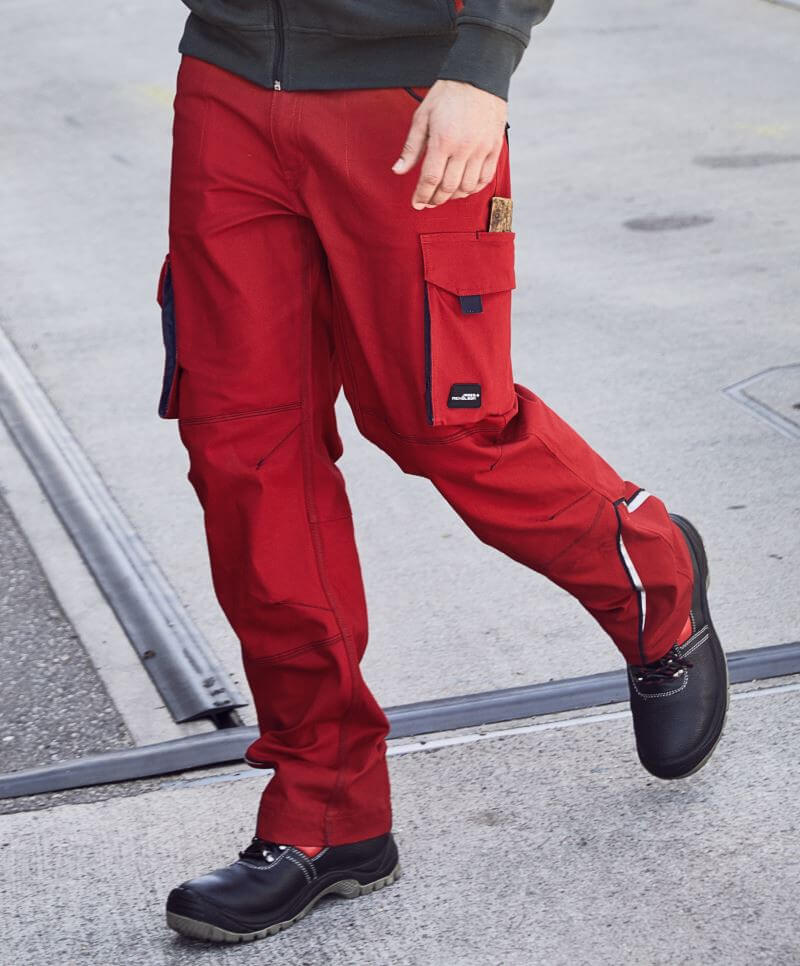 Pánské pracovní kalhoty, barevné, ergonomicky přizpůsobitelné díky obsahu elastanu, elastický pás s poutky na pásek, skryté knoflíky a zipy, několik kapes na nářadí, kapsa na pravítko, kapsa na mobilní telefon, pero, odolné proti roztržení, 3 směrné prošívaný šev, reflexní prvky (bez ochranné funkce), zepředu a vzadu. Doporučené prát do 60 °, vhodné do sušičky. Vyrobeno z 97% bavlny a 3% elastanu.