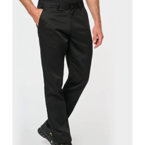 Materiál: 190g/m², 65% polyester, 35% bavlna. Elastický pas s poutky na opasek, zip a knoflík, 2 šikmé boční kapsy včetně 1 kapsy na lístek, 2 zadní kapsy s lemováním a zesílenými švy, poutko na zavěšení, odolný materiál, pratelné na 60°, lze sušit v sušičce při nízké teplotě, nelze chemicky čistit.