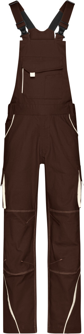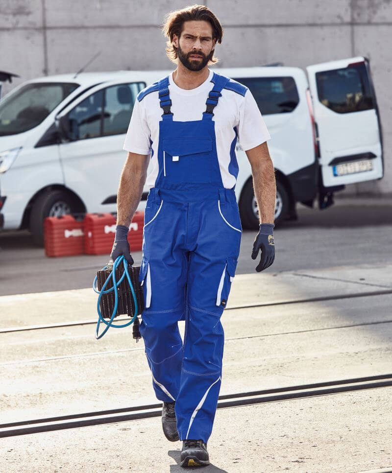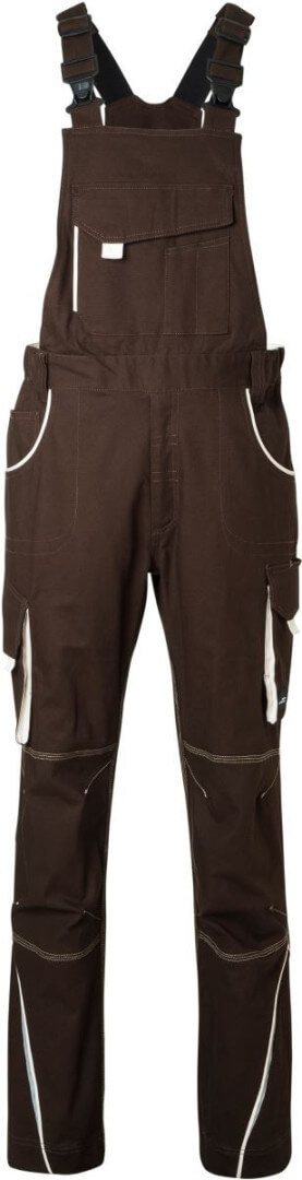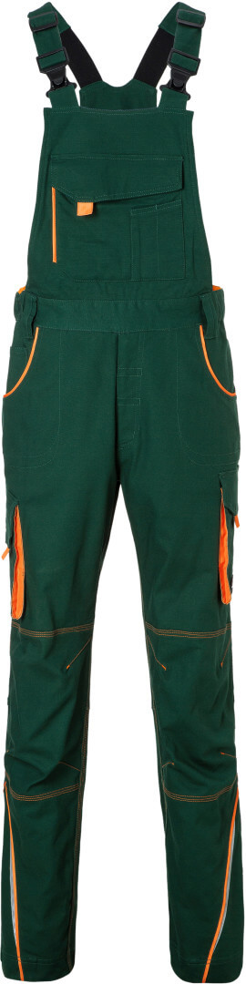Pánské pracovní kalhoty na šle, ergonomicky přizpůsobitelné díky obsahu elastanu, nastavitelné šle s elastickými ramínky, elastický pás s poutky na pásek, skryté knoflíky a zipy, několik kapes na nářadí, kapsa na pravítko, pero, prostorné kapsa se zipem na vnitřní straně nohavic, odolné proti roztržení, 3 pásmový prošívaný šev, reflexní prvky (bez ochranné funkce vpředu i vzadu, doporučené prát na 60 °, vhodné k sušení v sušičce. Vyrobeno z 97% bavlny a 3% elastanu.
