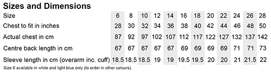 Materiál: 135g/m², 70% mercerovaná bavlna, 30% polyester, Oxford. Vypasovaný střih, vyztužená lemovka, nastavitelné manžety se 2 knoflíky, zaoblený lem, 1 náhradní knoflík, dvojité švy na rukávech a bocích, záševky na přední a zadní straně, zadní sedlo, pratelné na 50°, snadné žehlení, nelze sušit v sušičce.
