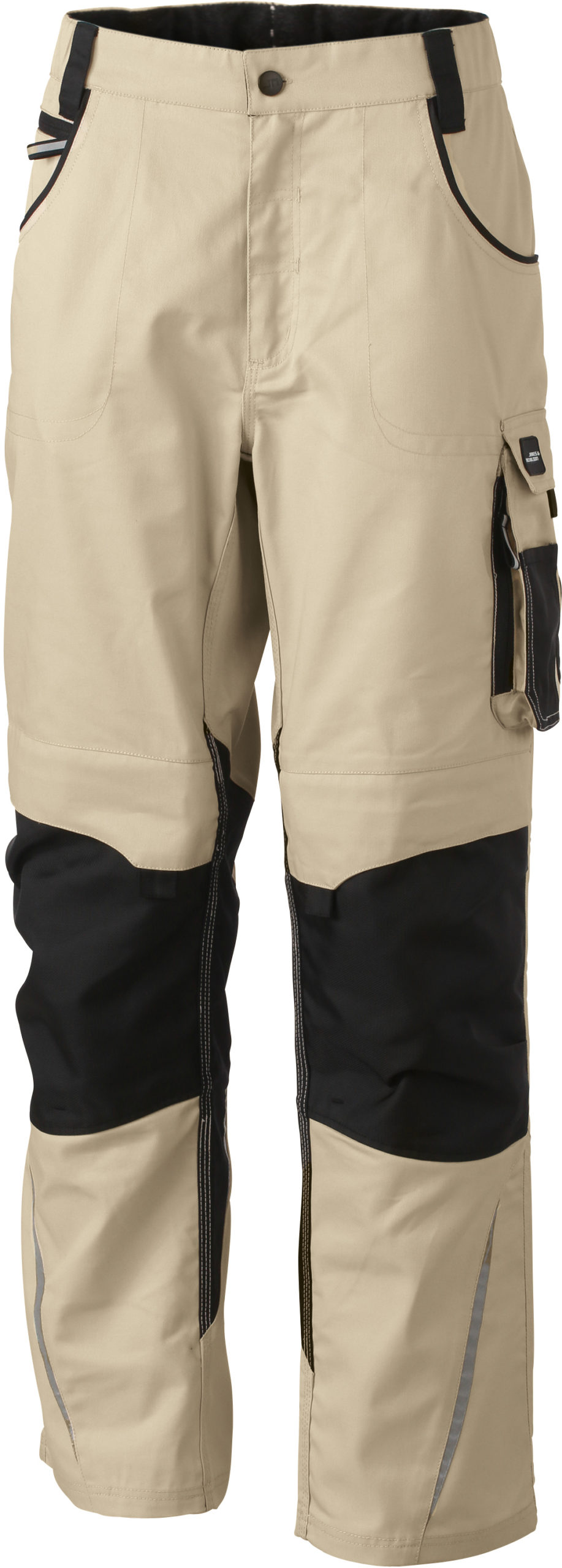 260g/m², 65% polyester, 35% bavlna, podsádka: 100% polyamid, Cordura® Robustní látka, elastický pásek s poutky na pásku, 2 kapsy se zipem, s kapsou na kolenou na polstrování zesílenou materiálem Cordura®, různé prostřižené kapsy a kapsy na nářadí, reflexní prvky vepředu a vzadu, vhodný polštář na kolena výr. č. JN823, k dos