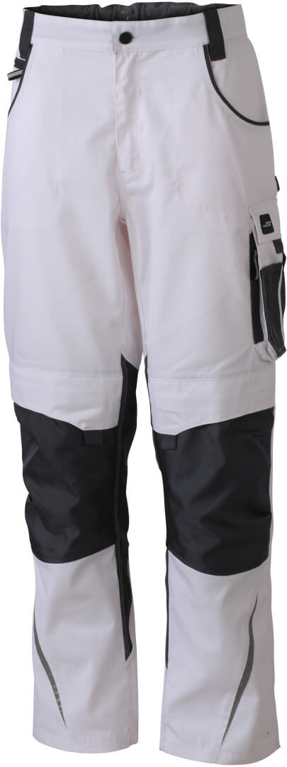 260g/m², 65% polyester, 35% bavlna, podsádka: 100% polyamid, Cordura® Robustní látka, elastický pásek s poutky na pásku, 2 kapsy se zipem, s kapsou na kolenou na polstrování zesílenou materiálem Cordura®, různé prostřižené kapsy a kapsy na nářadí, reflexní prvky vepředu a vzadu, vhodný polštář na kolena výr. č. JN823, k dos