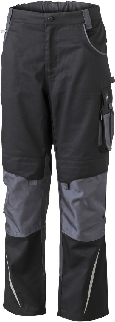 260g/m², 65% polyester, 35% bavlna, podsádka: 100% polyamid Cordura® robustní látka, elastický pásek s poutky na pásku, 2 kapsy se zipem, s kapsou na kolenou na polstrování zesílenou materiálem Cordura®, různé prostřižené kapsy a kapsy na nářadí, reflexní prvky vpředu a vzadu, vhodný polštář na kolena výr. č. JN823, k dost