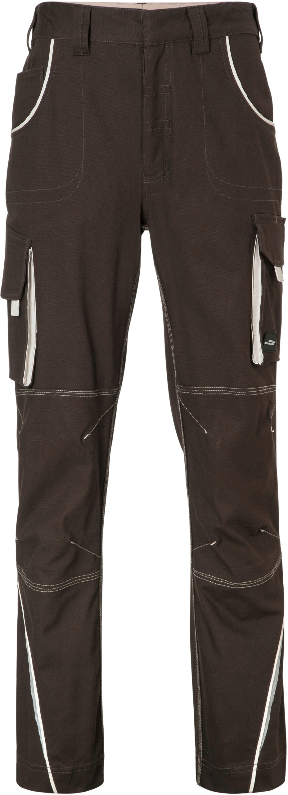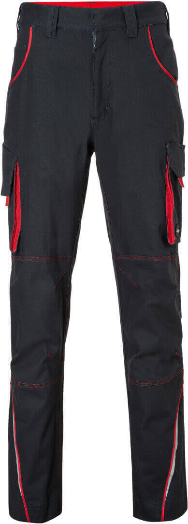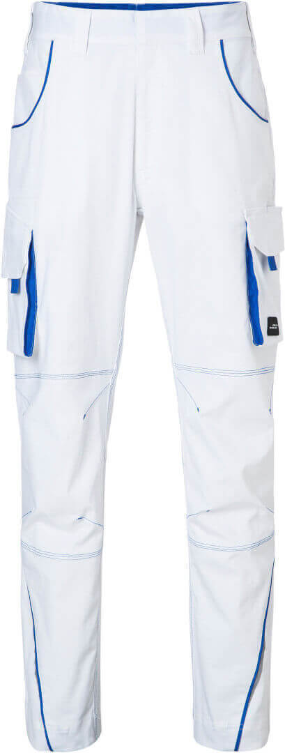 250g/m², 97% bavlna, 3% elastan lehké elastické plátno, pohodlné nošení díky elastanu a ergonomickému střihu, odolné trojité prošití, elastický pás s poutky, kapsa na metr, kapsy na nářadí, držáky na pera a kapsa na mobil, reflexní prvky na přední i zadní straně, skryté zipy a knoflíky,