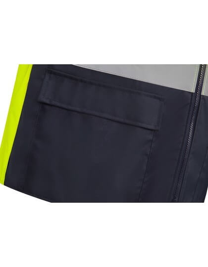 Odpovídá ENISO20471: 2013 Class 2 & Orange / Navy také vyhovuje RIS-3279-TOM | Vyrobeno ze 3 vrstev: 1) vnější voděodolný polyester Oxford potažený PU, 2) netkaná střední vrstva a 3) vnitřní fleecová podšívka, aby se maximalizovalo pohodlí a teplo | Lem poskytuje kontrast a pomáhá udržovat výrobek čistý | Náprsní kapsa na mobilní telefon s D-kroužkem | Dvě spodní kapsy | Přístup pro dekoraci/logo | Výrobce garantuje reflexní vlastnost podle normy EN pro 25 mycích cyklů při 40 ° C